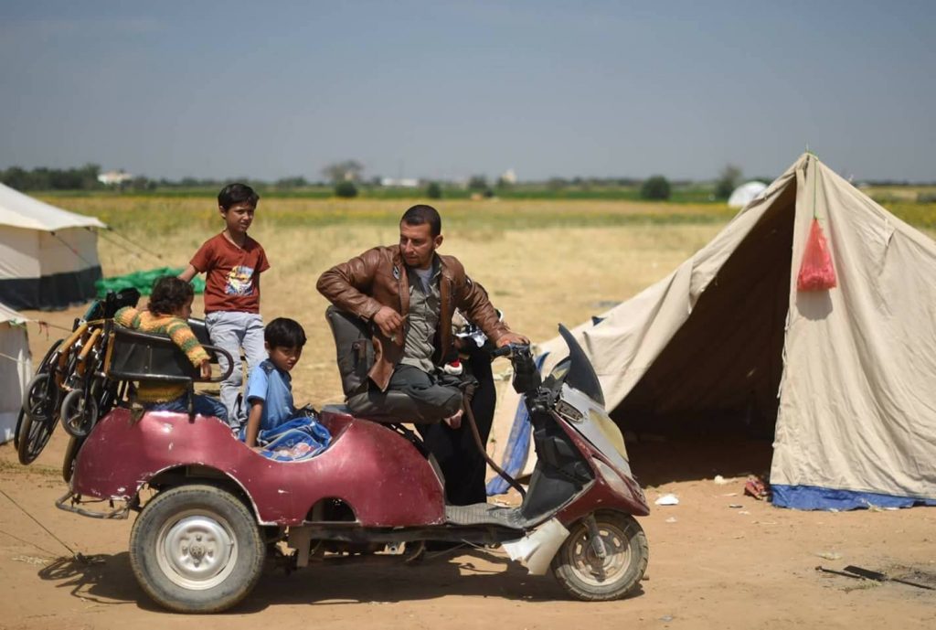 دراجة نارية صُممت بطريقة تناسب حالته الصحية، مزوَّدة بإطارين ومقعدين في الخلف، رافقت الشهيد أبو صلاح خلال مشاركته في مسيرة العودة، ومعه أطفاله الخمسة، الذين تتراوح أعمارهم ما بين سنة و8 سنوات، وزوجته آمنة أبو صلاح، قاطعاً مسافة 5 كيلومترات، حيث يسكن في بلدة عبسان الكبيرة شرق خانيونس.