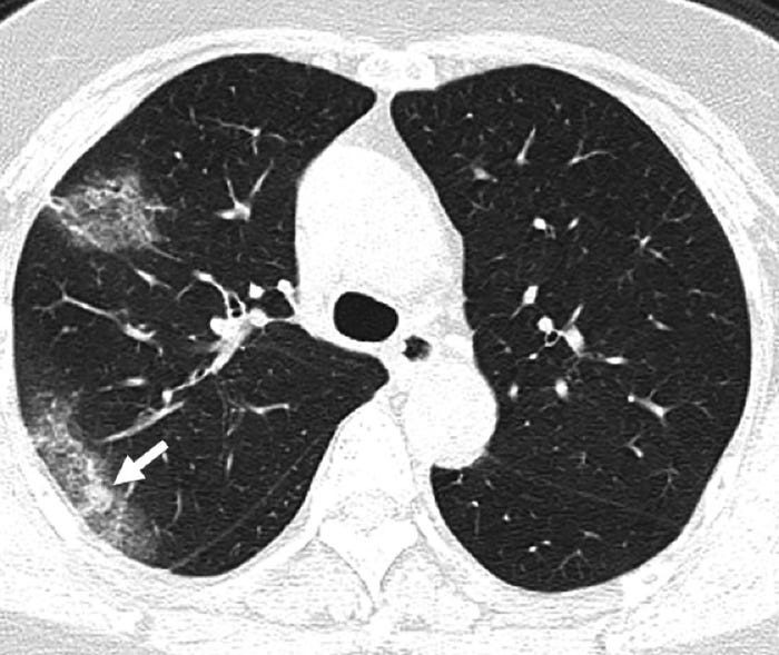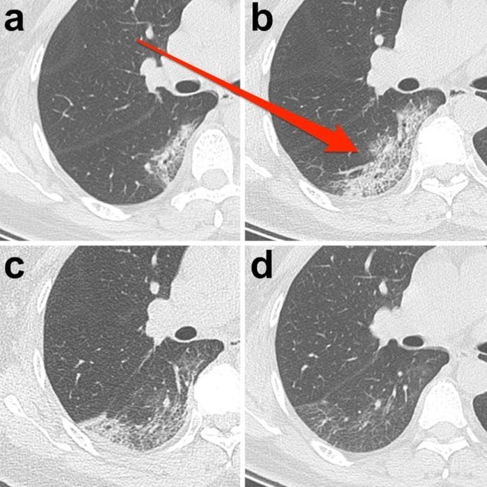 فقد صوِّرت المجموعة الأولى من فحوص التصوير المقطعي المحوسب في 7 يناير/كانون الثاني، بعد خمسة أيام من بدء ظهور الأعراض على المريض. وتظهر فيها بقع تشبه الزجاج المصنفر في قاع كلتا الرئتين.