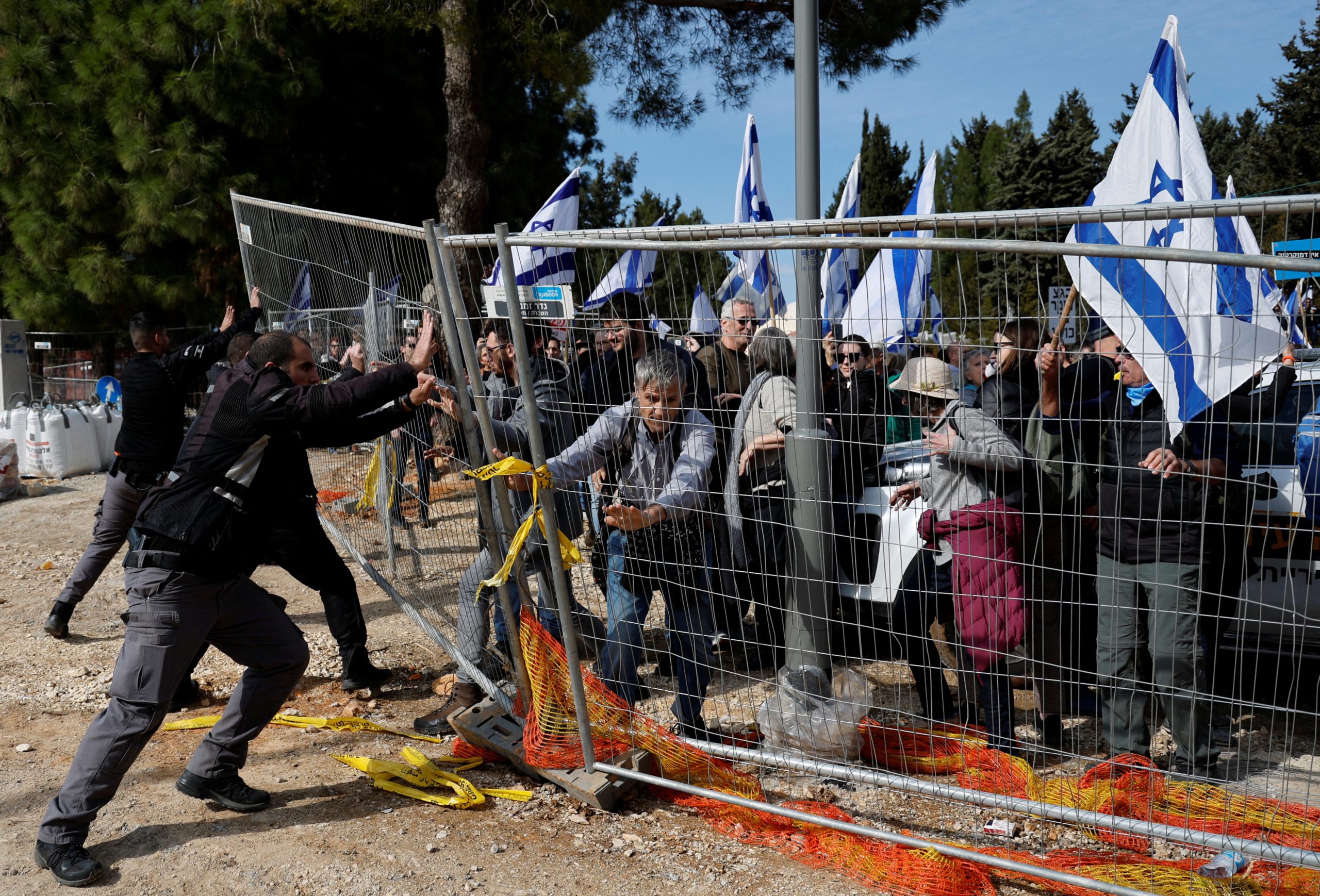 وتداول ناشطون عبر تويتر، الإثنين، مشاهد تُظهر محاولة عشرات المحتجين اقتحام الأسوار الحدودية بالقرب من مبنى الكنيست، وسط مواجهات مع أفراد الشرطة.