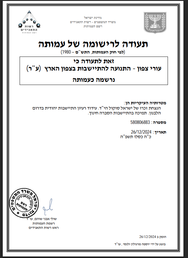 وتحظى حركة "يوري تسافون" بتسجيل رسمي في إسرائيل، وأظهرت بيانات تسجيلها التي اطلعنا عليها أنها تأسست بتاريخ 26 ديسمبر 2024، ومسجّلة بالرقم: 580806883.