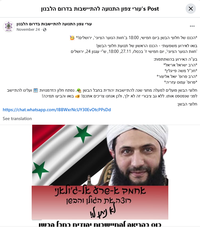 انطلاقاً من ذلك، دعت الحركة الوزراء الإسرائيليين إلى منح الضوء الأخضر للمستوطنين الراغبين بالاستيطان في جنوب سوريا، ما يسمح بترجمة المشروع الاستيطاني من طموح أيديولوجي إلى قرار سياسي مُعلن، قابل للتنفيذ على الأرض.