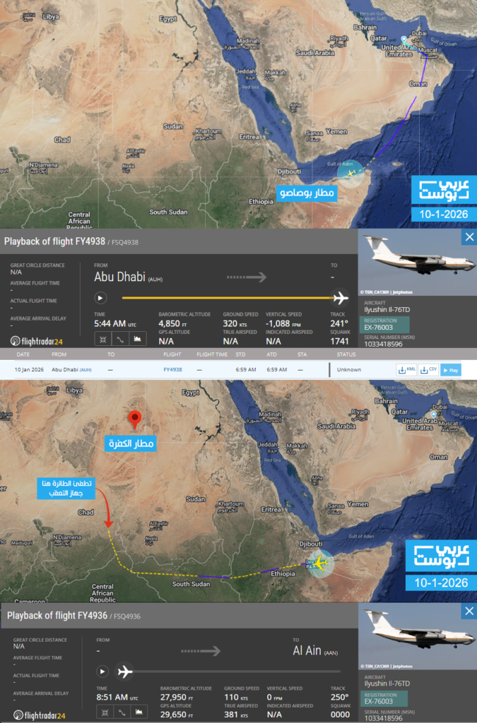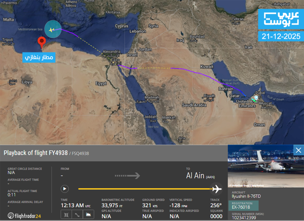 الطائرة EX-76003: تتخذ هذه الطائرة مساراً واضحاً ومتكرراً من أبوظبي نحو بنغازي حتى تاريخ 5 يناير 2026