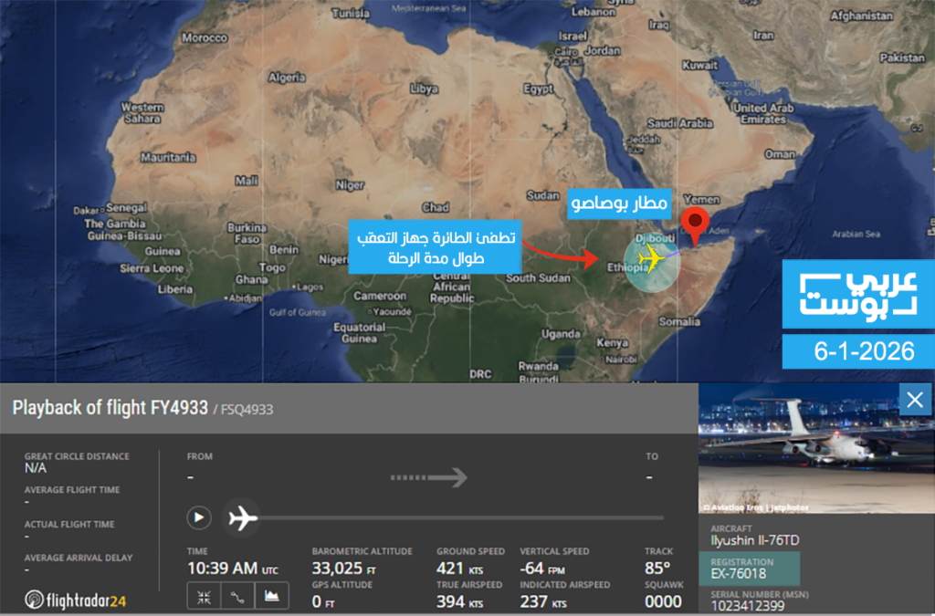 الطائرة EX-76018 في 6 يناير 2026 أصبح مسارها ذهاباً وإياباً من بوصاصو هو النمط السائد، مع توقف جهاز التعقب طوال مدة الرحلة تقريباً – – عربي بوست – FlightRadar24