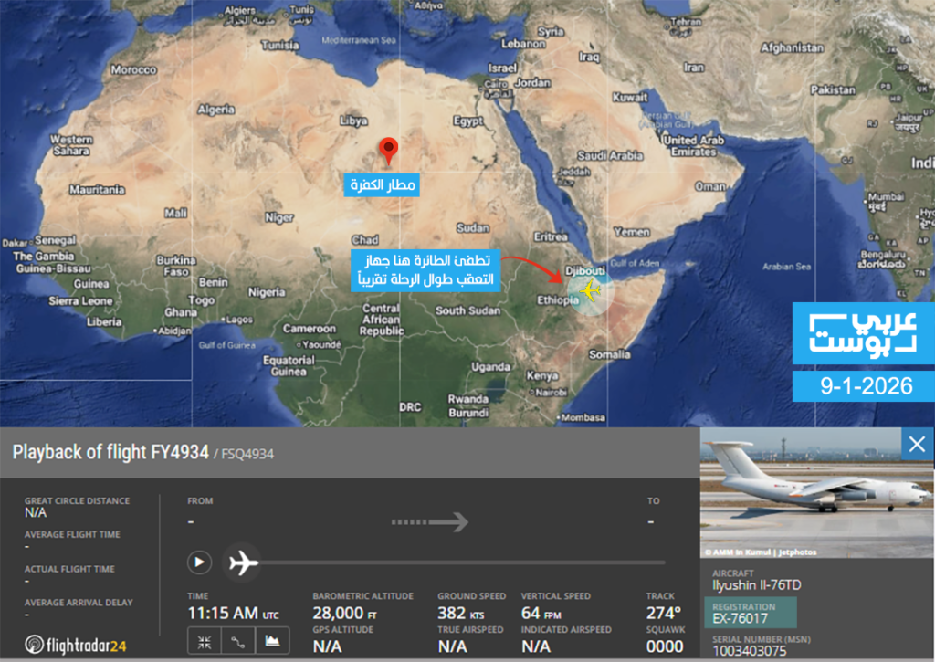 ركز تتبع حركة الطائرات على الفترة من نهاية ديسمبر/كانون الأول 2025 وحتى يوم 1 فبراير شباط 2025. وبلغ عدد الطائرات التي تم تتبع رحلاتها 3 طائرات شحن ثقيلة من طراز إليوشن آي إل-76IL.