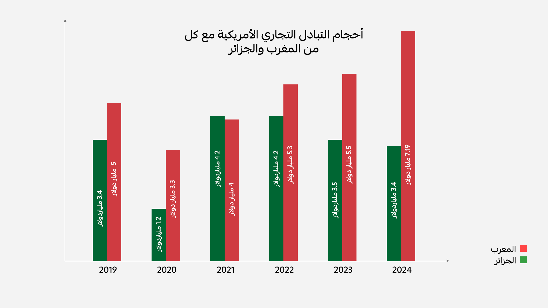 فالمغرب هو من أوائل البلدان العربية التي وقعت اتفاقية تجارة حرة مع الولايات المتحدة، دخل حيز التنفيذ عام 2006، ما أتاح نمواً في الصادرات الأمريكية. وتشير بيانات وزارة التجارة الأمريكية إلى أن فائض الولايات المتحدة التجاري مع المغرب قفز إلى 3.4 مليارات دولار في 2024 (صادرات 5.3 مليارات مقابل واردات 1.9 مليار).