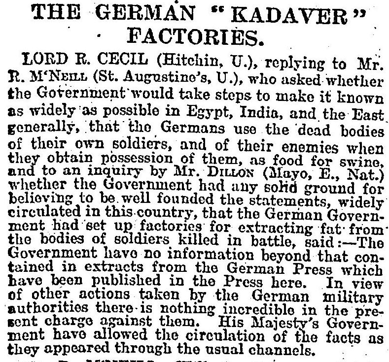 خلال الحرب العالمية الأولى، نشرت صحيفتا التايمز والديلي ميل البريطانيتان عام 1917 أخباراً مجهولة المصدر، عن مصنع في ألمانيا يستخرج مادة الجليسرين من جثث القتلى، ويستخدمها في صناعة الصابون والسمن.