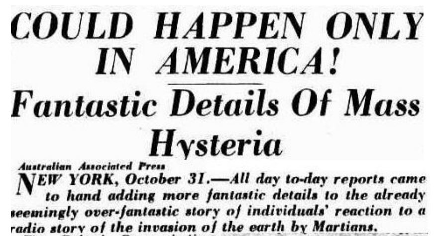 يوم الأحد، آخر أيام شهر أكتوبر/تشرين الأول عام 1938، نجحت شبكة إذاعية في كولومبيا في نشر الذعر، بعد أن بثت فصولاً من رواية حرب العوالم لويلز على هيئة سلسلة من الأخبار العاجلة، بدأتها بإيقاف للبرامج العادية والإعلان عن حدوث مجموعة من الانفجارات الغازية على المريخ، ومقتل 15 ألف شخص إثر سقوط نيزك في ولاية نيوجيرسي الأميركية.