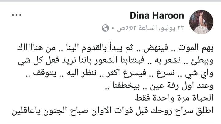 إذ كتبت هارون عبر حسابها على فيسبوك أن الإنسان يشعر باقتراب أجله بمجرد أن يهمَّ الموت لأخذ روحه، ويبدأ الإنسان مسرعاً في اقتناص الفرص لفعل كل شيء ممكناً قبل فوات الأوان.