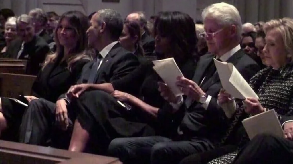 تميزت الصورة بأنها ليست كئيبة، رغم أنها أُخذت في جنازة؛ إذ يبتسم أوباما وبيل كلينتون بكل سعادة. ويعلو وجه بوش تلك الابتسامة المنحرفة التي تعبر عن أنه قد ألقى إحدى نكات الفتيان المراهقين التي يشتهر بها. يبدو أنهم مرتاحون. ولكن، ما هو مصدر هذا الارتياح؟ هل من الممكن أن يكون سبب ارتياحهم الجماعي هو أن ترمب لم يحضر؟