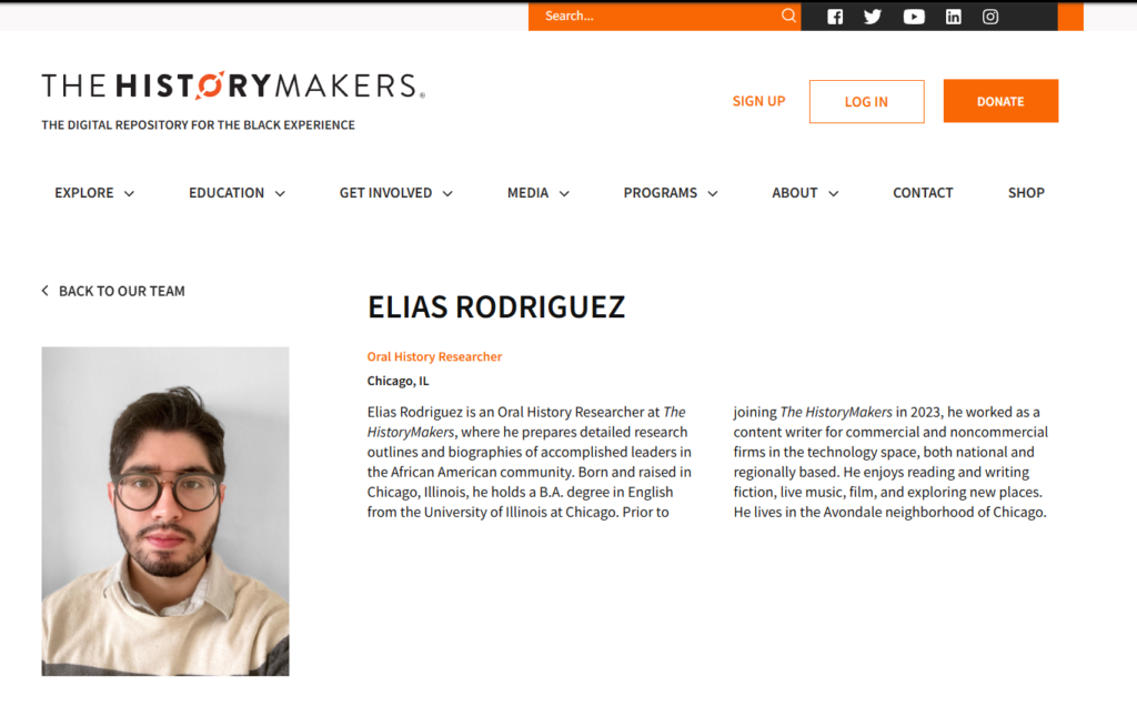 كما يظهر بروفايل لـ رودريغيز على موقع منظمة "The History Makers"، والتي عمل فيها كباحث في التاريخ. وتعنى المنظمة في توثيق قصص وتجارب الأمريكيين من أصول إفريقية.