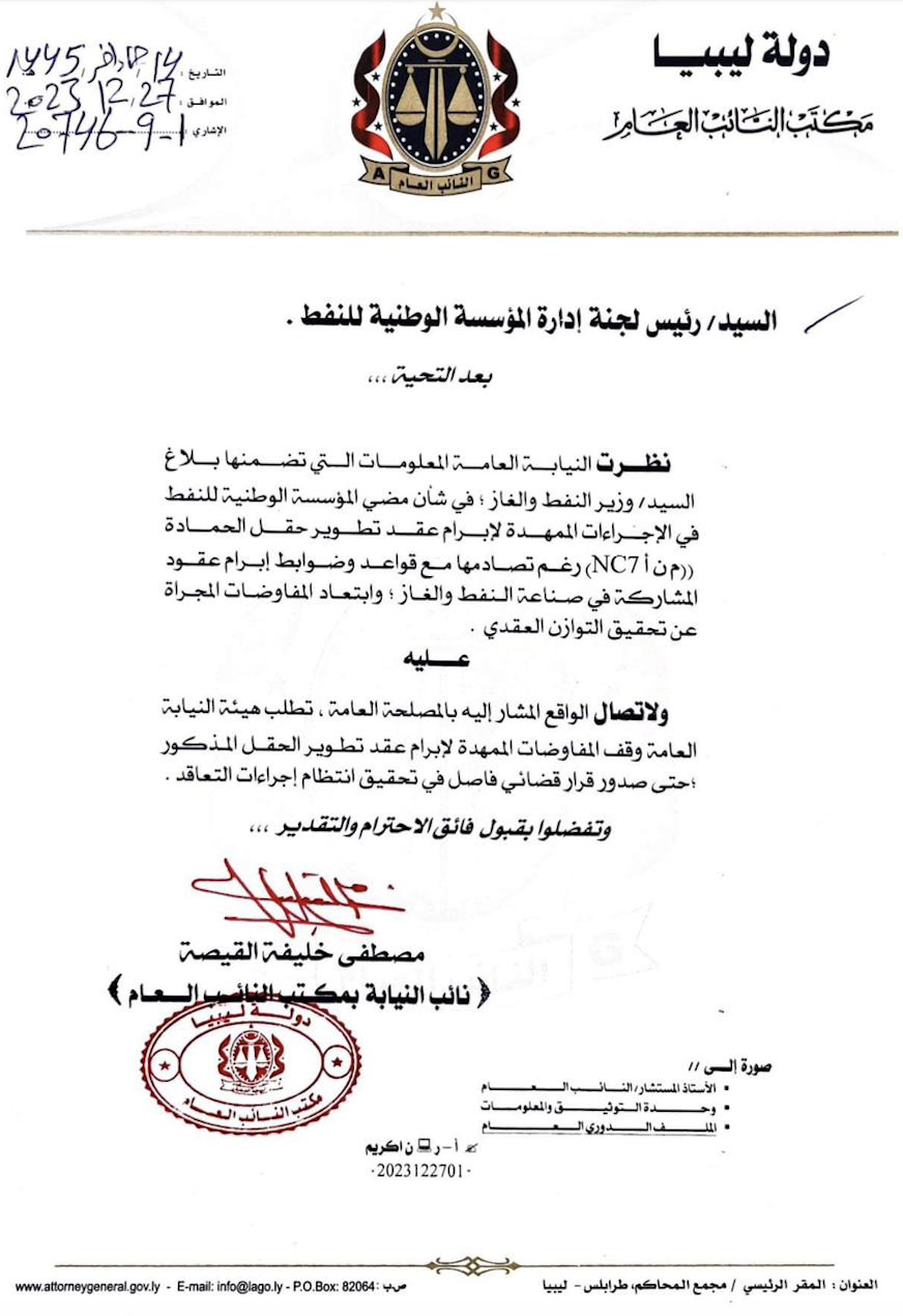 من جانبه، وجّه رئيس اللجنة عيسى محمد العريبي، خطاباً رسمياً إلى رئيس مجلس إدارة المؤسسة الوطنية للنفط، يؤكد فيه على ضرورة وقف أي تفاوض جديد بشأن الحقل أو مع أطراف أجنبية.