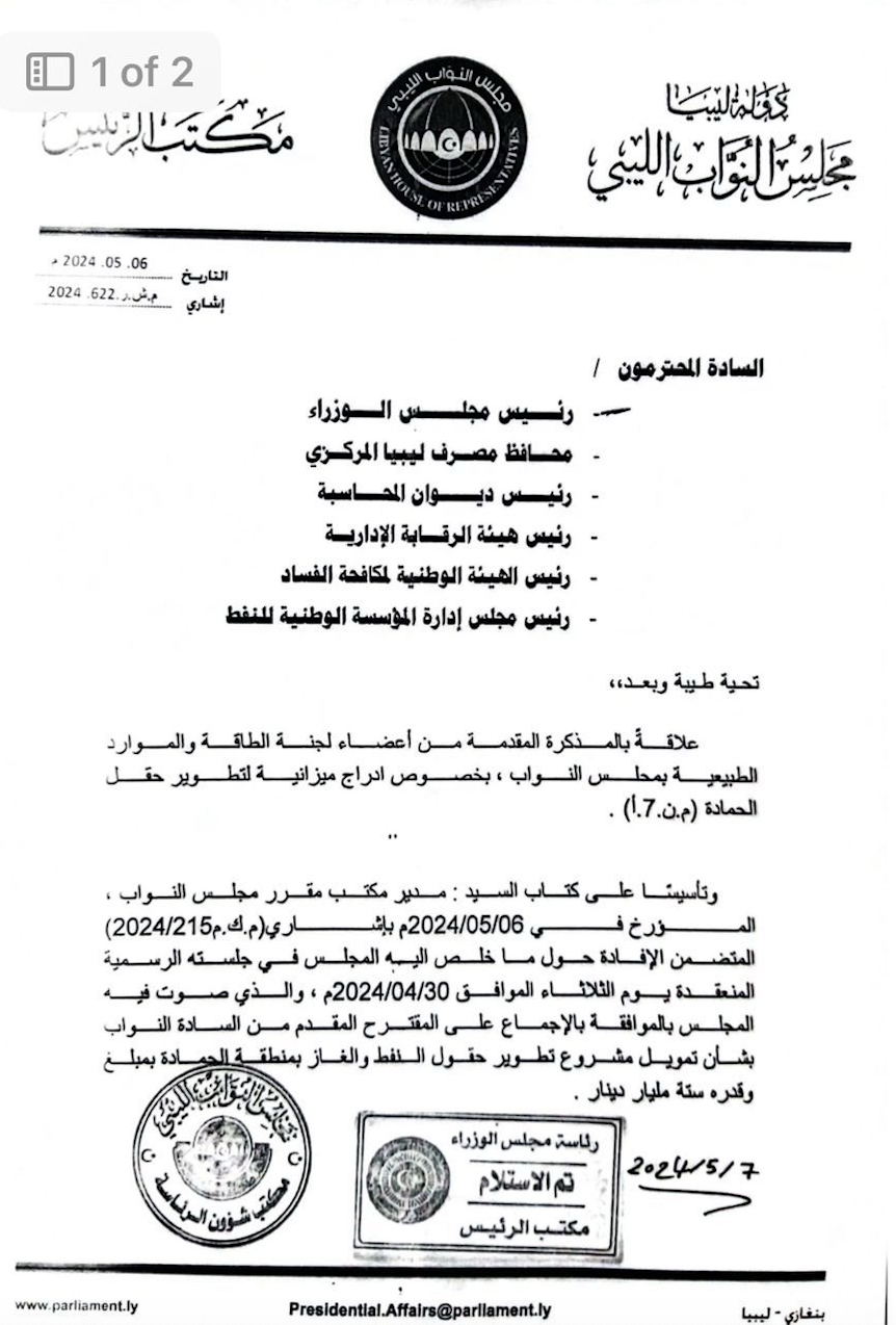 وتُظهر المراسلات الرسمية الصادرة عن مجلس النواب الليبي ولجنة الطاقة والموارد الطبيعية منذ منتصف عام 2023، أن السلطة التشريعية تتبنى موقفاً واضحاً وحاسماً من ملف التعاقدات النفطية، خاصة في ما يتعلق بحقل الحمادة (حقل NC7 الليبي).