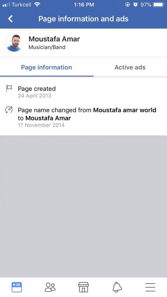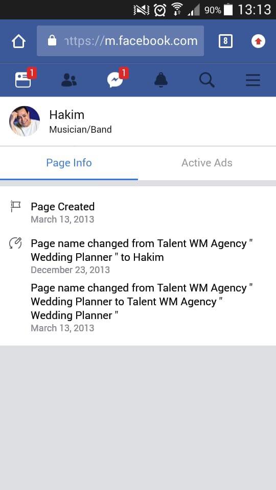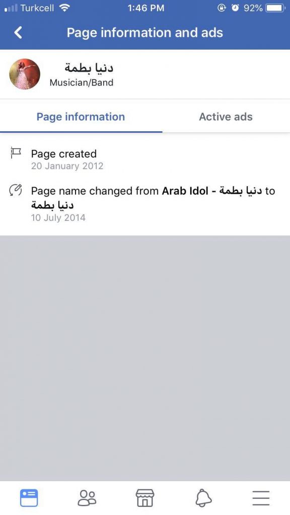 فمن خلال الضغط على أيقونة Info and Ads الموجودة أسفل يسار الصفحة على فيسبوك، ستتمكن من الوصول إلى بعض المعلومات عن الصفحة، ومنها التغييرات التي تمت في الاسم وعدد المرات وزمانها.