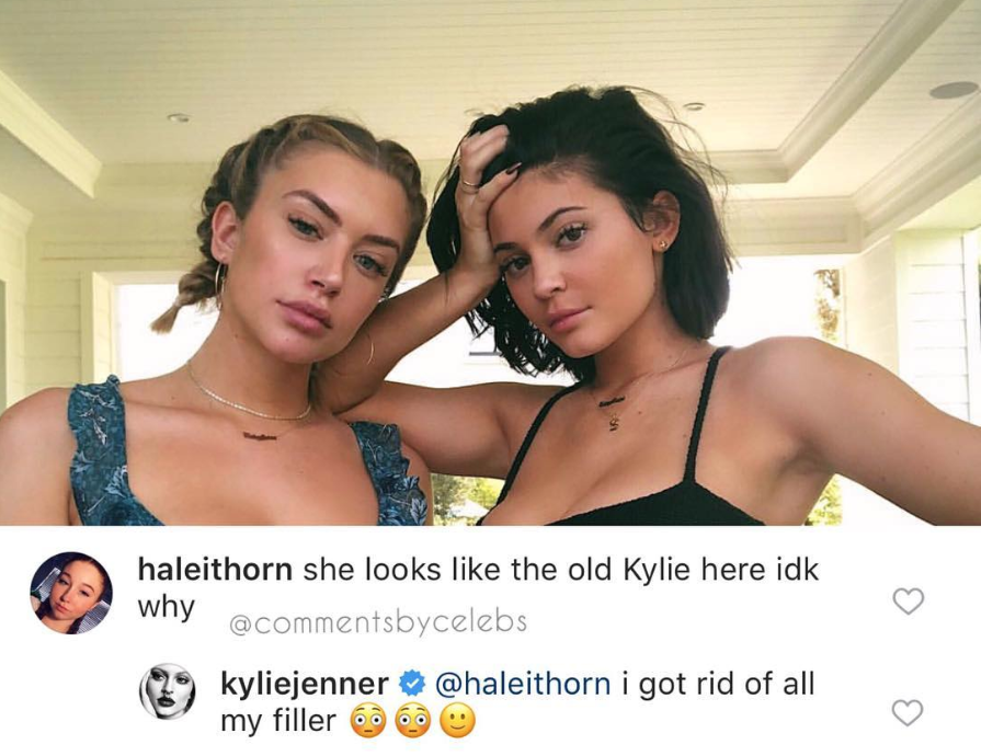 وكانت أصغر شقيقات عائلة كارداشيان (20 عاماً) قد أعلنت أنها تخلَّصت من الفيلير، من خلال ردِّها على تعليق إحدى متابعيها عبر موقع "إنستغرام"، على صورةٍ لها برفقة صديقتها – نشرتها في وقتٍ سابق من شهر تموز/يوليو الجاري – قالت في التعليق: "تبدو وكأنها كايلي القديمة، لستُ أدري لماذا". لتُجيب كايلي: "تخلَّصتُ من كلّ الفيلير". لتتصدَّر بذلك عناوين الصحف العالمية.