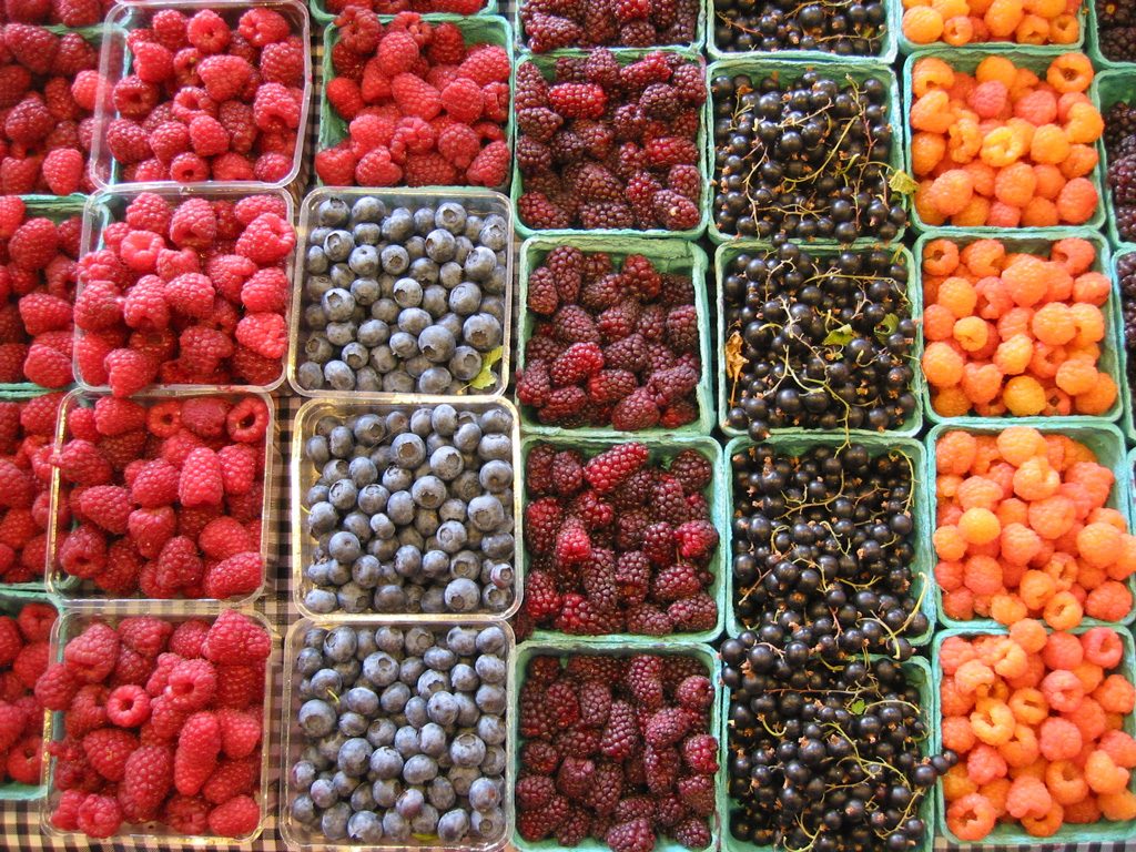 التوت الأزرق blueberries، والتوت الأسود، والفراولة، وتوت العليق الأحمر أو Raspberries وهو حامض النكهة بعض الشيء، والتوت البري أو cranberries، وأخيراً التوت الذهبي.