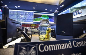 كائن فضائي صغير داخل وعاء زجاجي يُزيِّن مركز القيادة البديل لقيادة دفاع الفضاء الجوي الأميركية الشمالية "نوراد" داخل مركز جبل شايان للقوات الجوية في مدينة كولورادو سبرينغز، في ولاية كولورادو الأميركية.