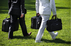 مساعد عسكري يحمل في يده اليسرى ما يُسمى بـ"كرة القدم النووية"، بينما يتبع الرئيس الأميركي دونالد ترمب عبر الحديقة الجنوبية للبيت الأبيض تجاه المروحية الرئاسية مارين وان في العاصمة واشنطن. تحوي الحقيبة، المزودة بمجسات استشعار تبرز من الخلف، مجلداً أسود به خيارات للضربة النووية، وقائمة بمخابئ سرية ليحتمي فيها الرئيس، وبطاقة بلاستيكية لشفرات شن الهجوم النووي.