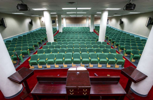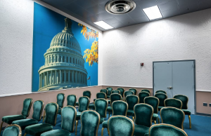 غرفة مؤتمرات صحفية داخل مخبأ نووي، كان فيما سبق سرياً، بُني أثناء الحرب الباردة لاستضافة أعضاء الكونغرس أسفل غرينبريير، وهو منتجع 4 نجوم قرب مدينة وايت سيلفر سبرينغز في ولاية ويست فرجينيا.